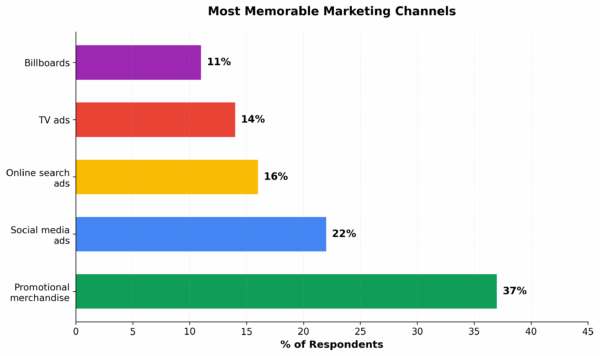When asked which channels create the strongest recall, respondents ranked promotional merchandise first — ahead of social media, online ads, and TV.