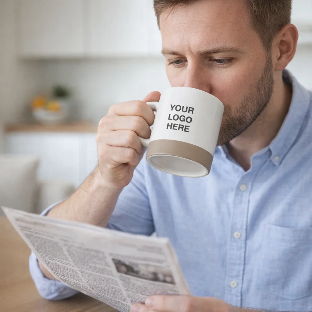 Elevate your brand presence with the 330ml Contrast Coffee Mugs Branded, a perfect blend of style and functionality. This round stoneware coffee mug features a chic matte finish complemented by a contrasting natural base, making it an eye-catching addition to any office or event. Each mug is thoughtfully presented in a natural gift box, enhancing its appeal as a promotional giveaway or client gift.