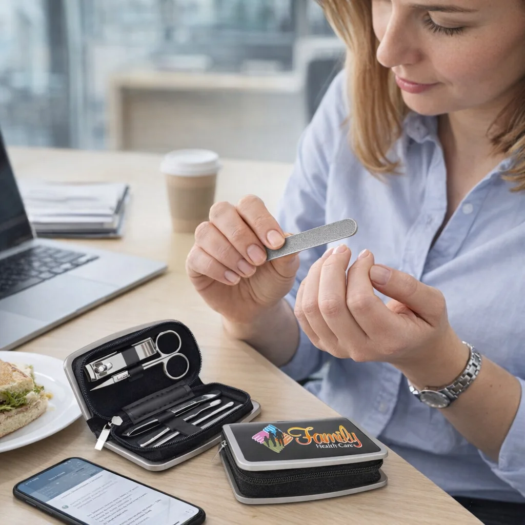Picture hosting a corporate event where guests leave not just with memories, but with a thoughtful gift that speaks to your brand’s commitment to quality and care. The Aikon Manicure Set is a six-piece manicure set elegantly packaged in a compact zippered PU case with matte chrome trim. This stylish set is perfect for small businesses looking to make a lasting impression through promotional giveaways or branded client gifts. Its sleek design ensures that it stands out, making it a practical addition to any personal care routine. What’s more, this set is an ideal choice for those who appreciate both functionality and aesthetics in their wellness offerings.