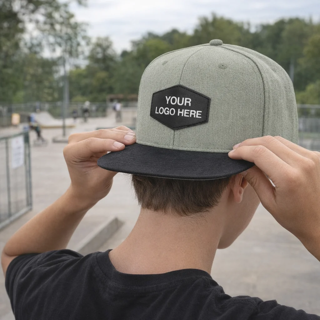 - Features a stylish flat peak and a matching leather-look hexagonal patch.
