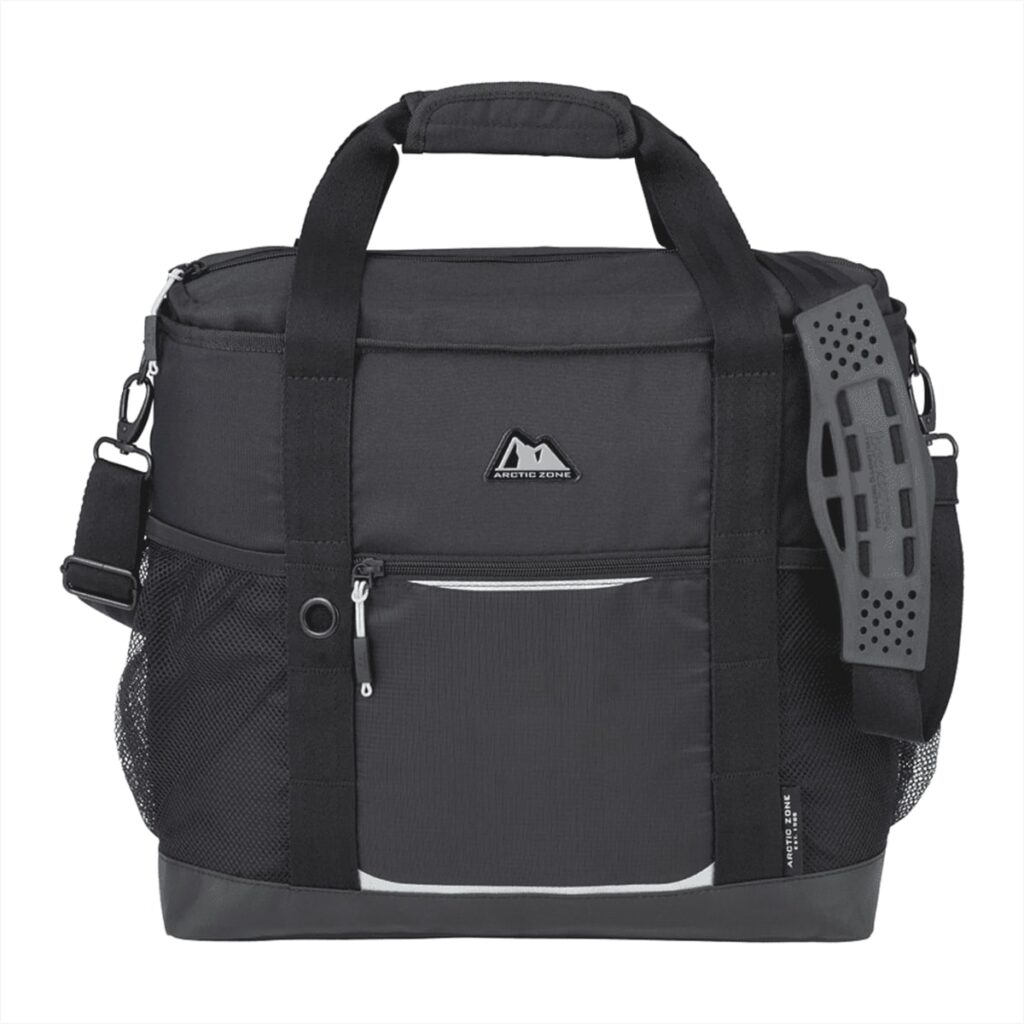 Turn heads with the Arctic Zone 30-can crib cooler, designed to keep contents cold and prevent leaks with its sturdy PEVA lining. Stay on-the-go with its adjustable shoulder strap and grab handles, making it a portable solution for all your chilling needs.