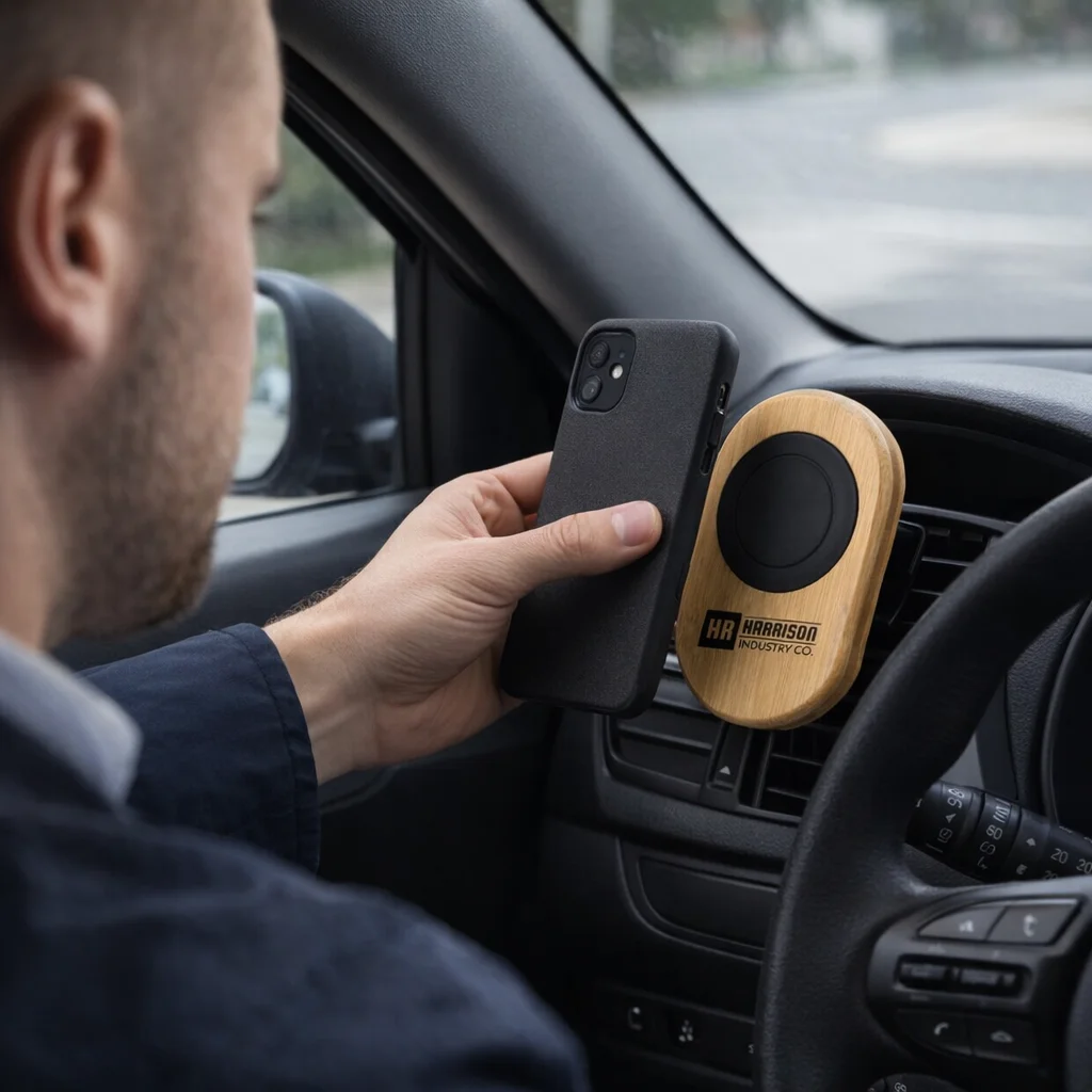 What sets the Bamboo Phone Holder apart is its magnetic plate system, allowing you to quickly and securely attach your phone with minimal fuss. This means you can focus on the road ahead while staying connected. For small businesses looking to offer a unique promotional giveaway or branded client gift, this holder combines functionality with a touch of elegance.