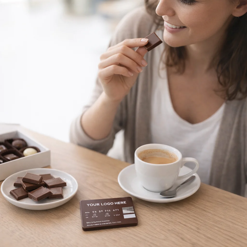 - Standard-size chocolate business cards designed for sharing contact information.