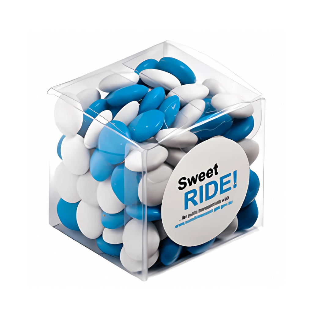 Delight your clients and event attendees with our Chocolate Jelly Beans in Med Cube. These 110g chocolate beans, resembling popular Smarties, come in a variety of vibrant colors including black, white, blue, green, red, yellow, and pink. The soft plastic cube packaging not only protects the treats but also serves as an eye-catching display that can enhance your brand visibility.