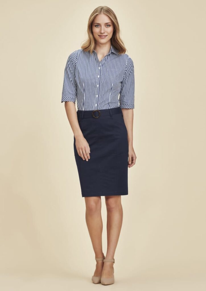 Crafted from a blend of cotton and elastane, the fabric provides added stretch for comfort and ease of movement throughout the day. The soft peached hand feel enhances the overall wearing experience, making it a go-to choice for corporate uniforms or stylish office wear. With sizes ranging from 4 to 26, this skirt accommodates a diverse workforce, ensuring everyone can look their best.