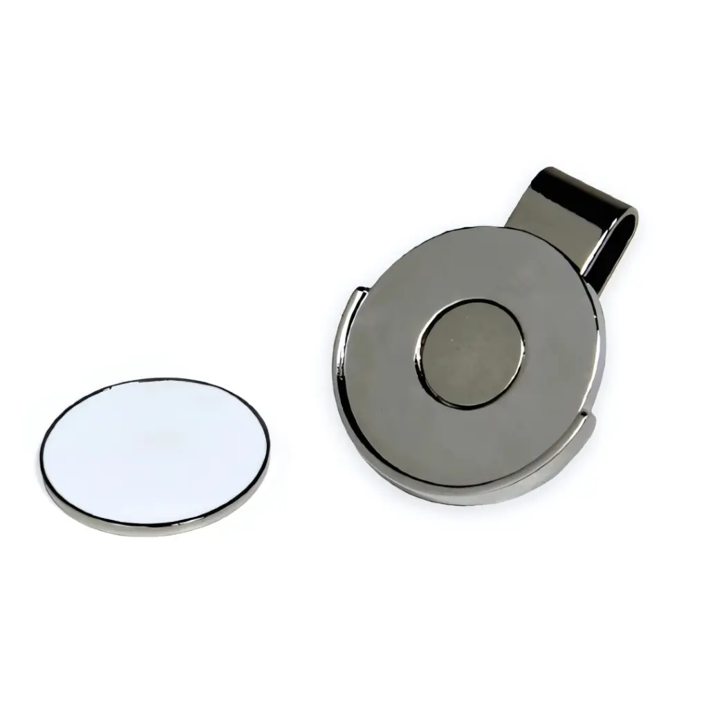 The Golf Hat Clip features a sturdy metal clip that easily hooks onto the peak of your cap. It includes a round disk with a magnet at its center, allowing for a seamless connection with the separate flat disk ball marker, which also contains a magnet. This clever design means you can quickly detach the marker when needed, impressing your golf mates with your efficiency.