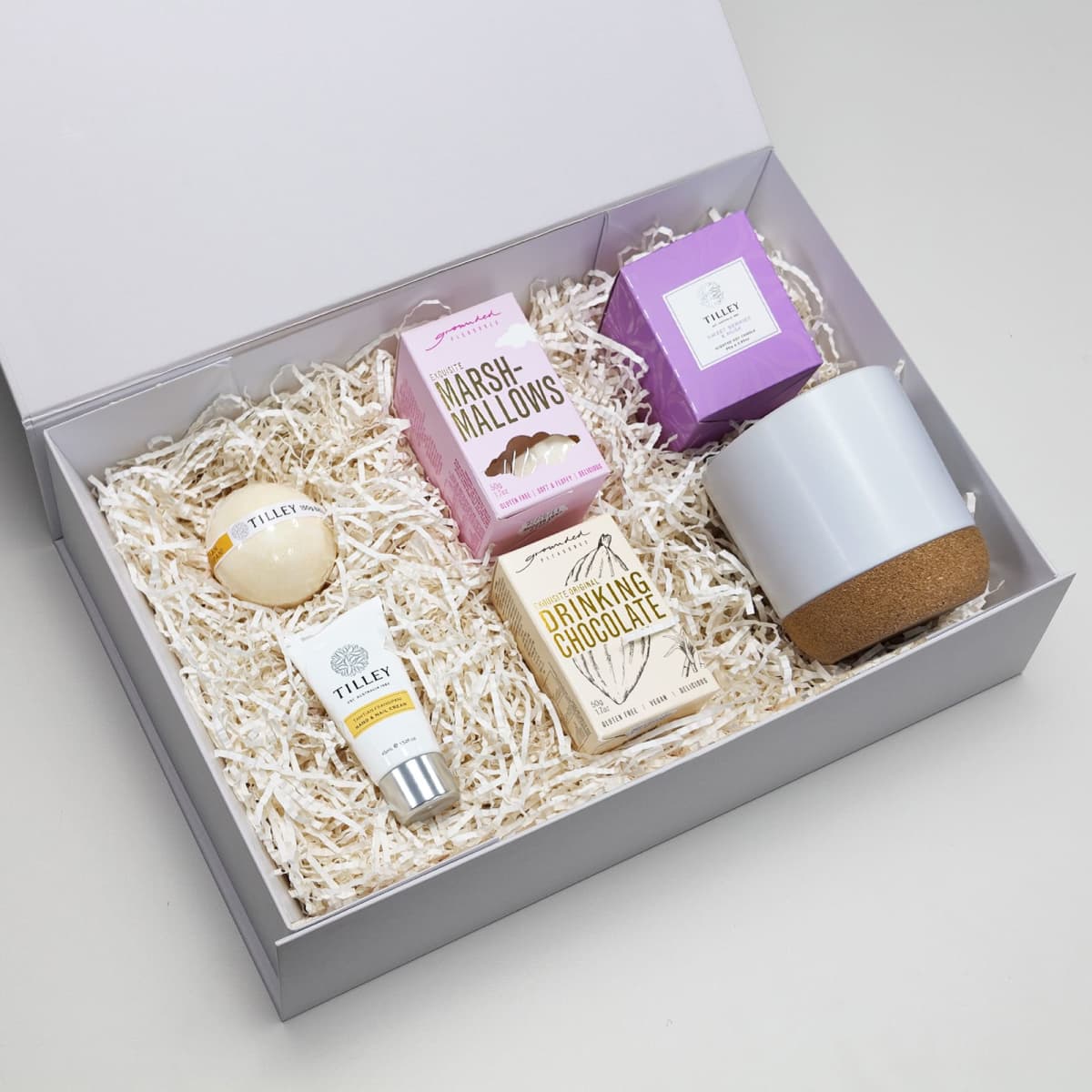 The Me Time Gift Box (Cosy Indulgence) is a curated set designed to create a quiet, comforting pause in the middle of a busy day. Combining warm drinks, self-care items, and soft fragrance elements, it brings together simple rituals that help people slow down and reset. Presented in a magnetic-close gift box, it’s positioned as a thoughtful option for client gifting, team rewards, or personal appreciation.