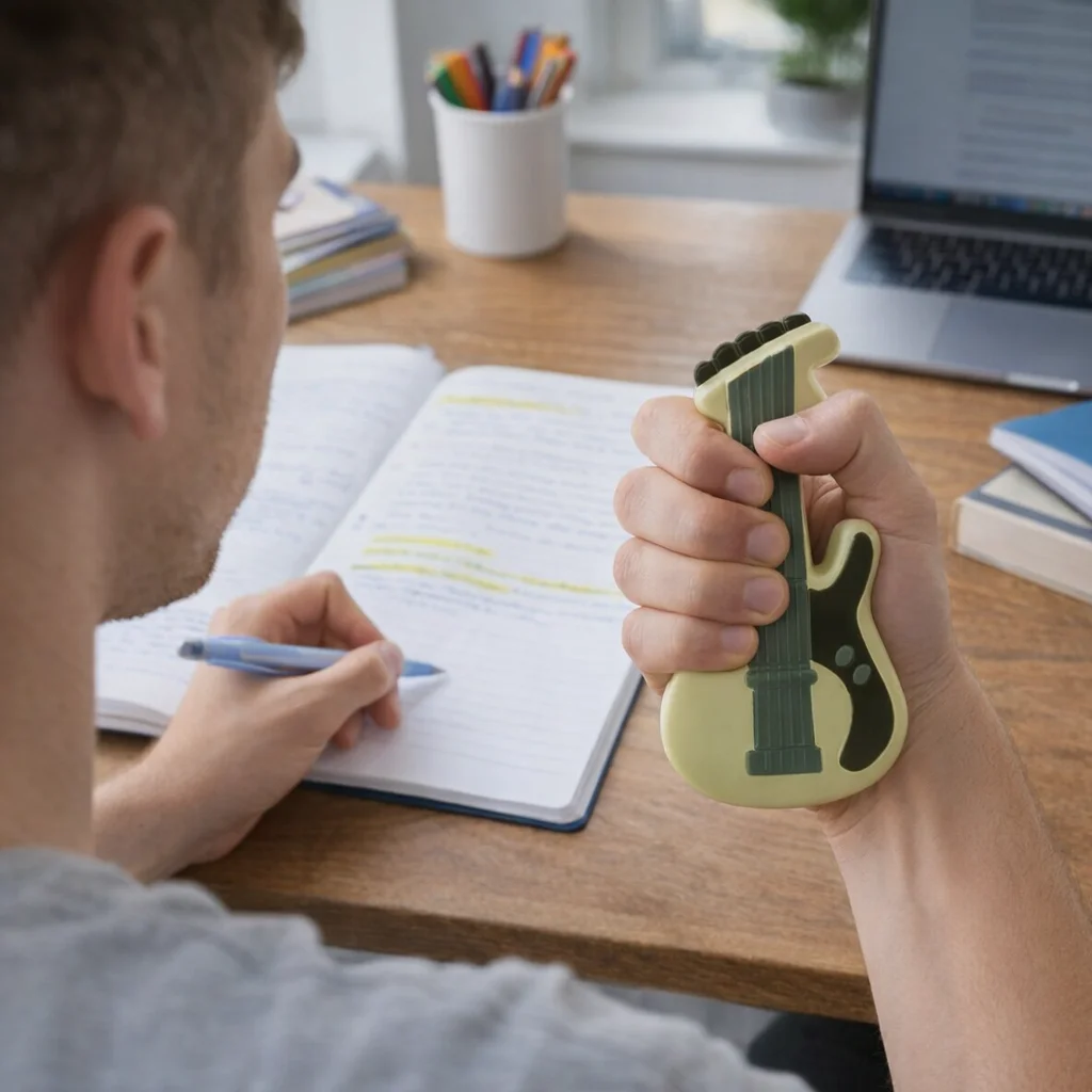 - Each stress guitar features a unique shape, color, and density.