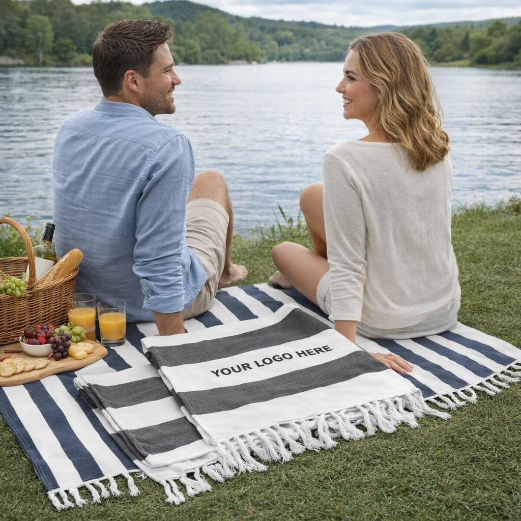 Imagine a sunny day at the beach, where your brand stands out with the Rustic Style Cotton Towels. These towels are not just any ordinary beach accessory; they are crafted from 200gsm 100% cotton, ensuring a soft and absorbent experience for your clients. The rustic weave, adorned with stylish stripes and a charming fringed trim, adds a touch of elegance that sets them apart from generic alternatives.