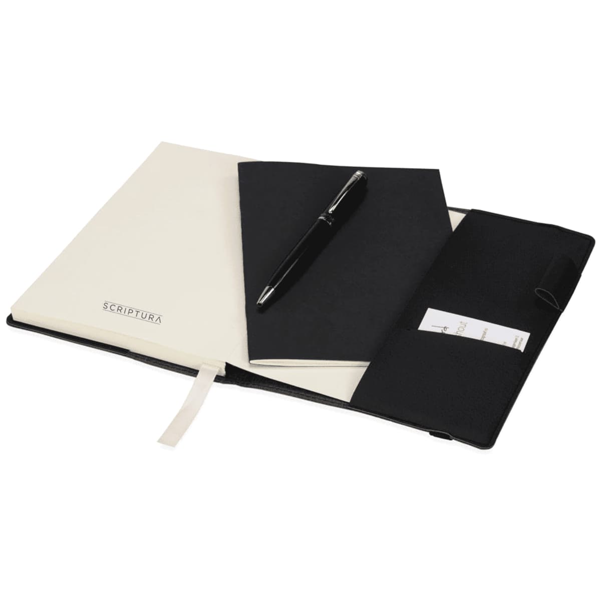 Scriptura Notebook & Pen Giftset: Elegant, Practical, and Customisable. The Scriptura Notebook & Pen Giftset offers a sophisticated, all-in-one solution for note-taking and professional use. Featuring an exclusive design with a flex cover, this notebook contains 80 sheets of 80gsm lined cream paper, perfect for writing or sketching. The integrated pen loop ensures you always have a pen handy, while the business card insert inside the back cover adds an extra layer of convenience.