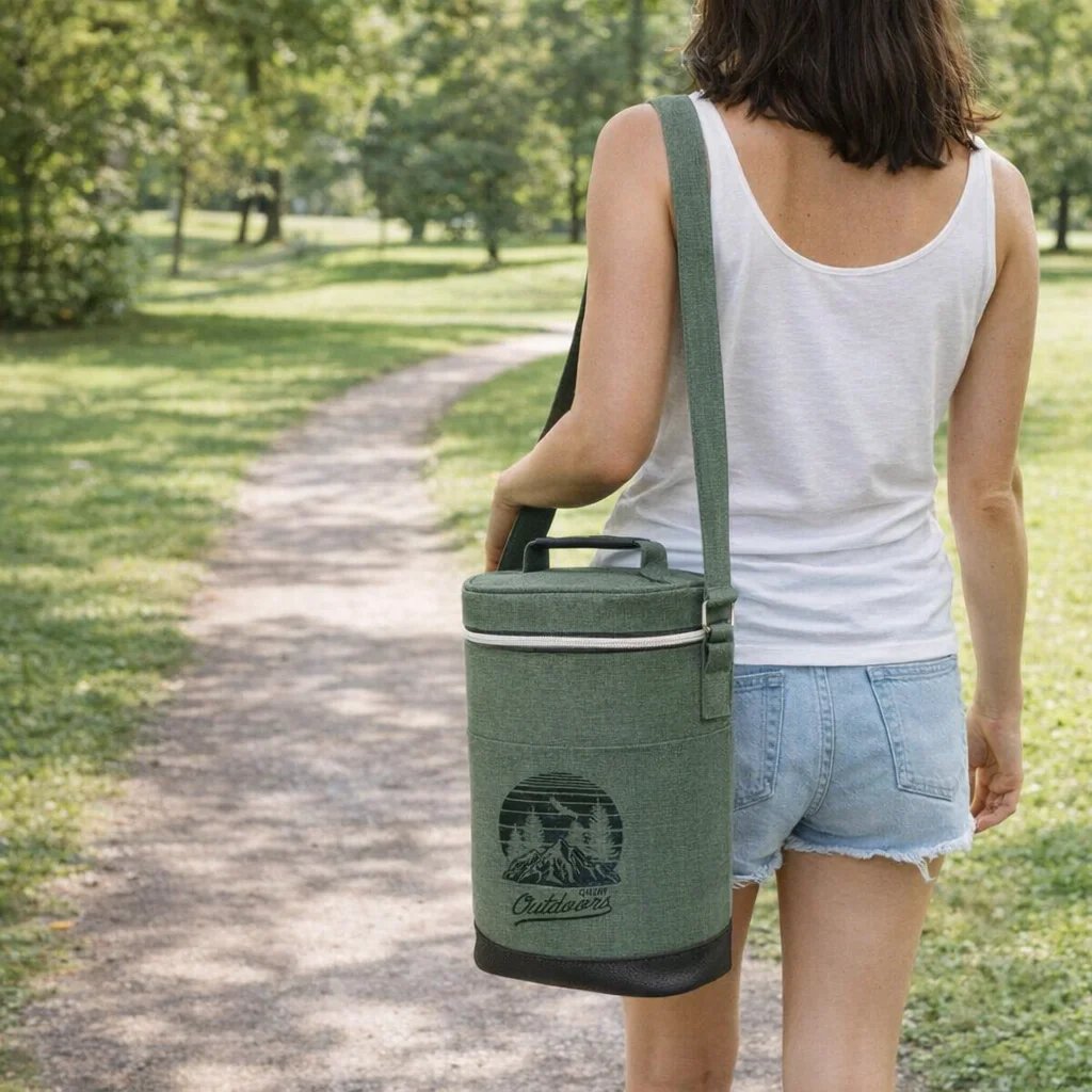 With an adjustable shoulder strap and a convenient carry handle, this bag is easy to transport, while the slip pocket on the front adds extra functionality. The top closure is secured with a sleek electroplated silver zip, combining practicality with a touch of elegance. This wine chiller bag is not just a practical accessory; it’s a stylish statement piece that can elevate your brand’s presence at events.