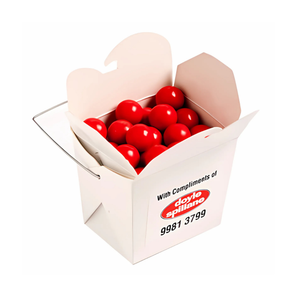 Visualize your next tradeshow or corporate event where you want to leave a lasting impression on potential clients. The White Noodle Box Filled With Jaffas is an eye-catching and delightful treat that not only satisfies sweet cravings but also serves as a unique promotional item. Each box is filled with 100g of vibrant orange choc drops that resemble Jaffas, making them a fun and memorable giveaway.